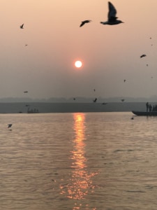 ガンジス川に太陽が出てくる瞬間、水面に走る一筋の光に祈りを捧げる太陽信仰があります。