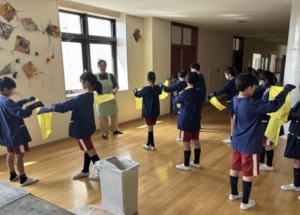 座学では、普段自分たちが身にまとう繊維について気づきがあったように感じられ、染色体験では、「きれいな色になぁ~れ~」と心を込めて染液と生地に話しかけお染めをしている姿がほほえましく見られました。